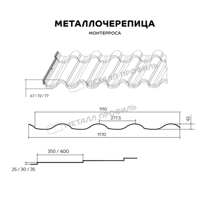 МОНТЕРРОСА — это оригинальный высокий профиль металлочерепицы. Его глубина составляет 67, 72 и 77 мм. Кровля, покрытая данной стальной черепицей, похожа на глиняную. Этот профиль обеспечит оригинальный внешний вид вашему дому. Производитель предлагает различные варианты высоты (25, 30 или 35 мм) и длины (350 либо 400 мм) ступенек; полагаем, вы найдёте удовлетворяющее вашим требованиям сочетание. Подарите своему дому эстетику элегантных выразительных линий классического профиля!