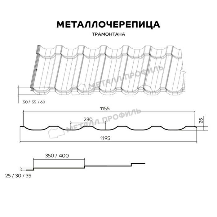 ТРАМОНТАНА — это принципиально новый профиль металлочерепицы от Компании Металл Профиль. Это оптимальное решение для кровель, площадь которых больше средней. Выбирайте необходимую высоту (25, 30, 35 мм) и длину (350, 400 мм) ступенек, глубину (50, 55, 60 мм) профиля. Металлочерепица ТРАМОНТАНА привлекает внимание оригинальным внешним видом — узким гребнем и широким прогибом волны. Также она отличается повышенной жёсткостью, поэтому её можно эксплуатировать в районах, где кровля подвергается повышенным ветровым нагрузкам. ТРАМОНТАНА — для прочной крыши!