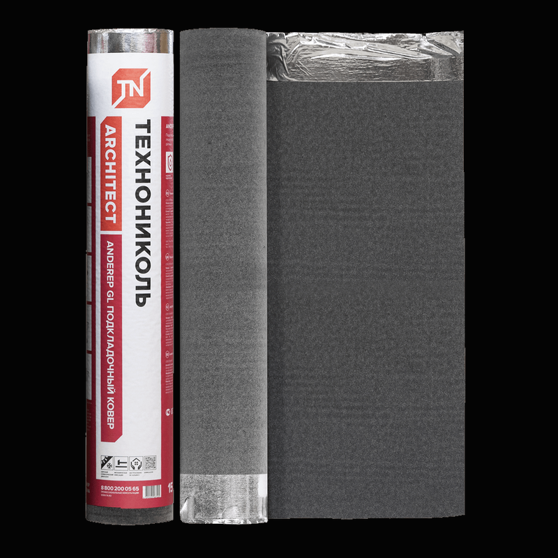 Битумно-полимерный подкладочный ковер механической фиксации с клеевыми монтажными полосами с основой из стеклохолста для скатных кровель с финишным покрытием из гибкой битумной черепицы.